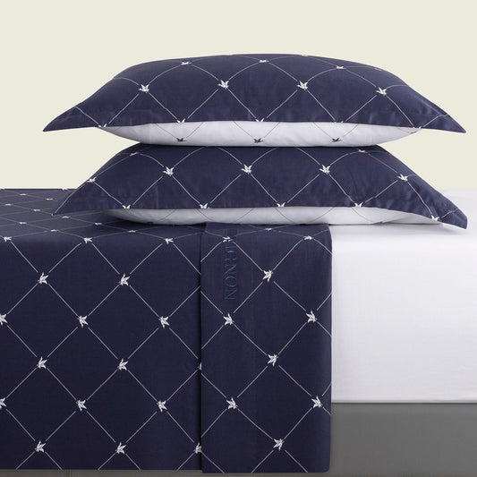 Ensemble de draps : drap-housse, drap plat, taie(s) d'oreiller en satin de coton - Canards Evy bleu