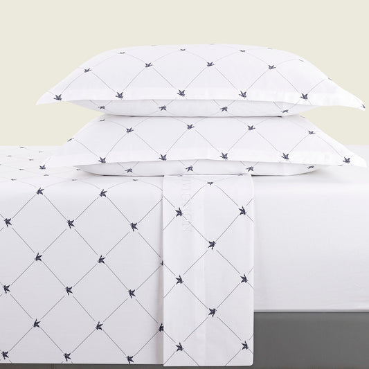 Ensemble de draps : drap-housse, drap plat, taie(s) d'oreiller en satin de coton - Canards Evy blanc