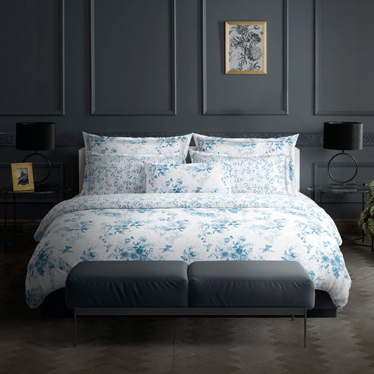 Housse de couette + taie(s) d'oreiller satin de coton - Bleu Floral blanc