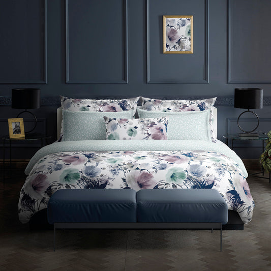 Housse de couette + taie(s) satin de coton - Fleurs Lavande