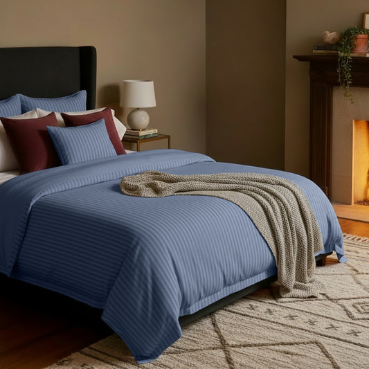 Housse de couette + taie d'oreiller satin de coton rayure tissé dobby - Bleu 06