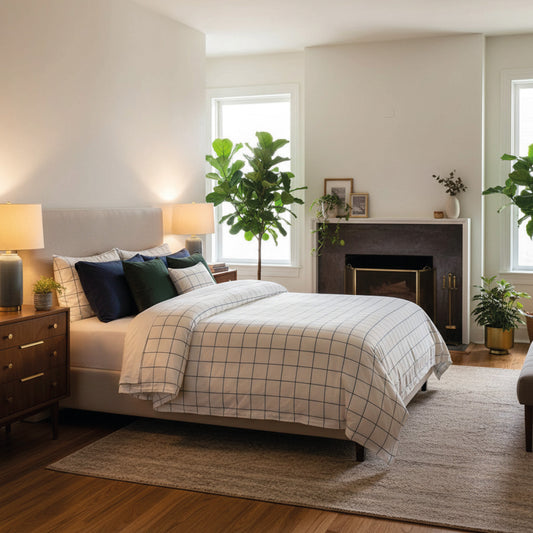 <p>Housse de couette + taie d'oreiller satin de coton - Carreaux minimalistes Blanc / Bleu</p>