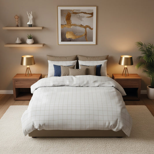 <p>Housse de couette + taie d'oreiller satin de coton - Carreaux minimalistes Blanc / Taupe</p>