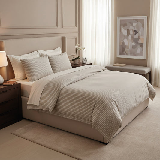<p>Housse de couette + taie d'oreiller satin de coton - �l�gance ray�e Taupe</p>