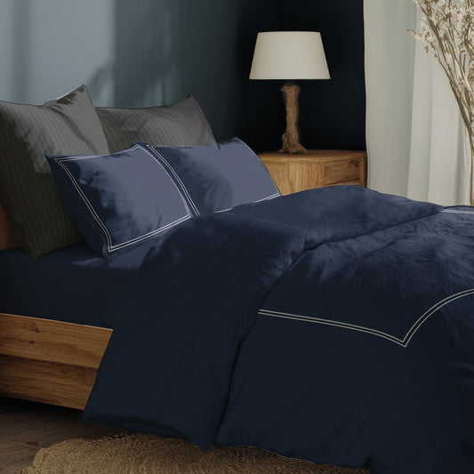 Housse de couette + taie d'oreiller satin de coton - Annecy Blanc / Bleu fonce