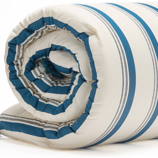 <p>�dredon avec glands satin de coton - Mateo Blanc / Bleu - 140 x 200 cm</p>
