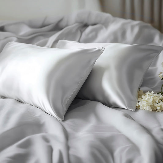 Housse de couette + taie d'oreiller satin de coton - Douceur royale Gris / Blanc