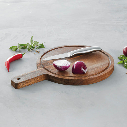 Planche réversible à servir et à découper ronde en bois d'acacia avec poignée