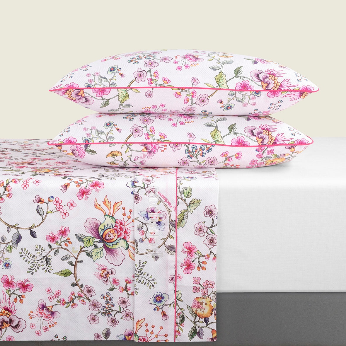 Ensemble de draps satin de coton - Jardin secret Blanc / Rose blush