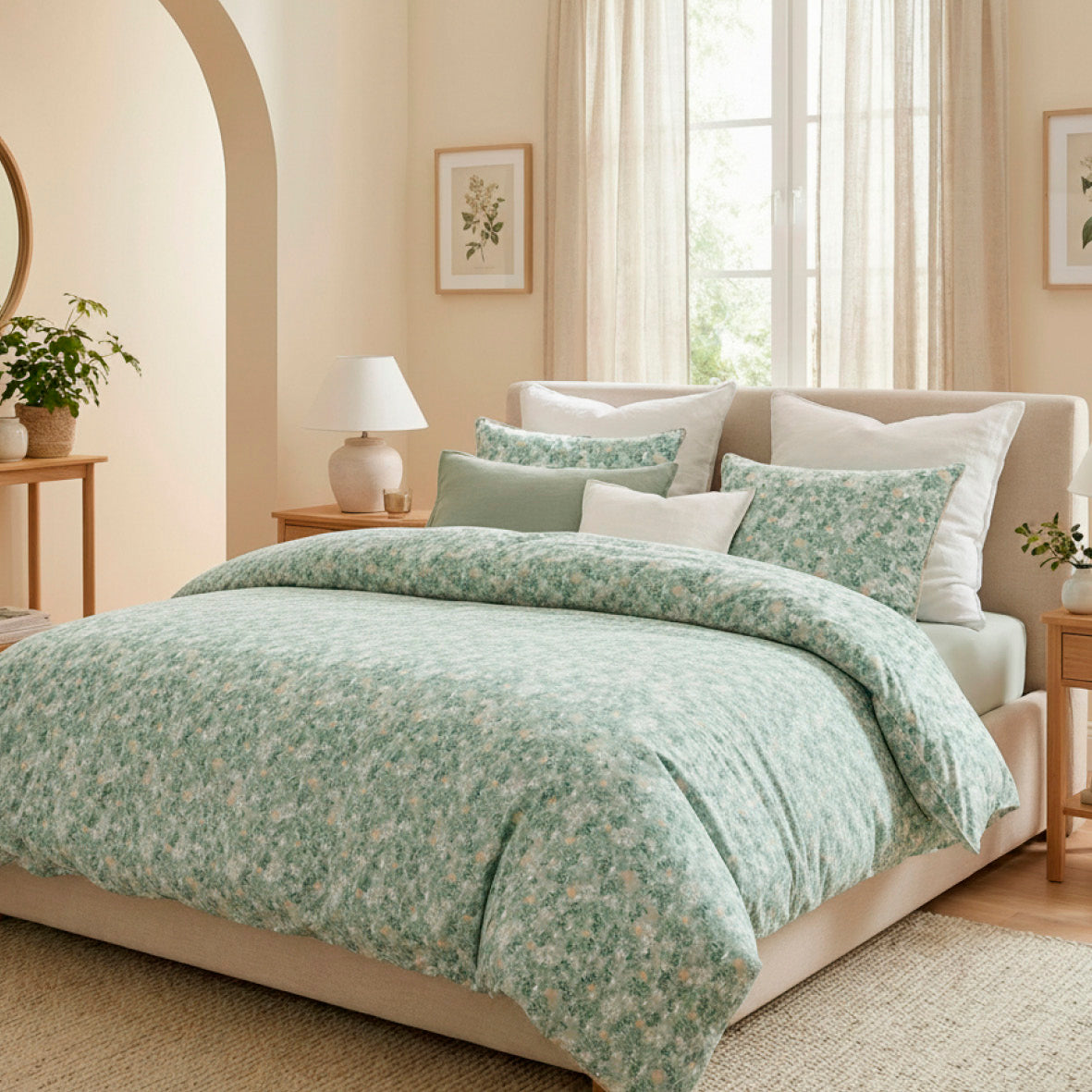 Duvet cover + pillowcase cotton satin - Feuillage fleuri Light green / Light green