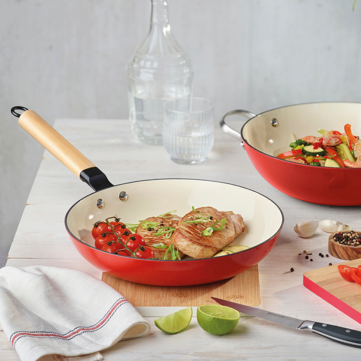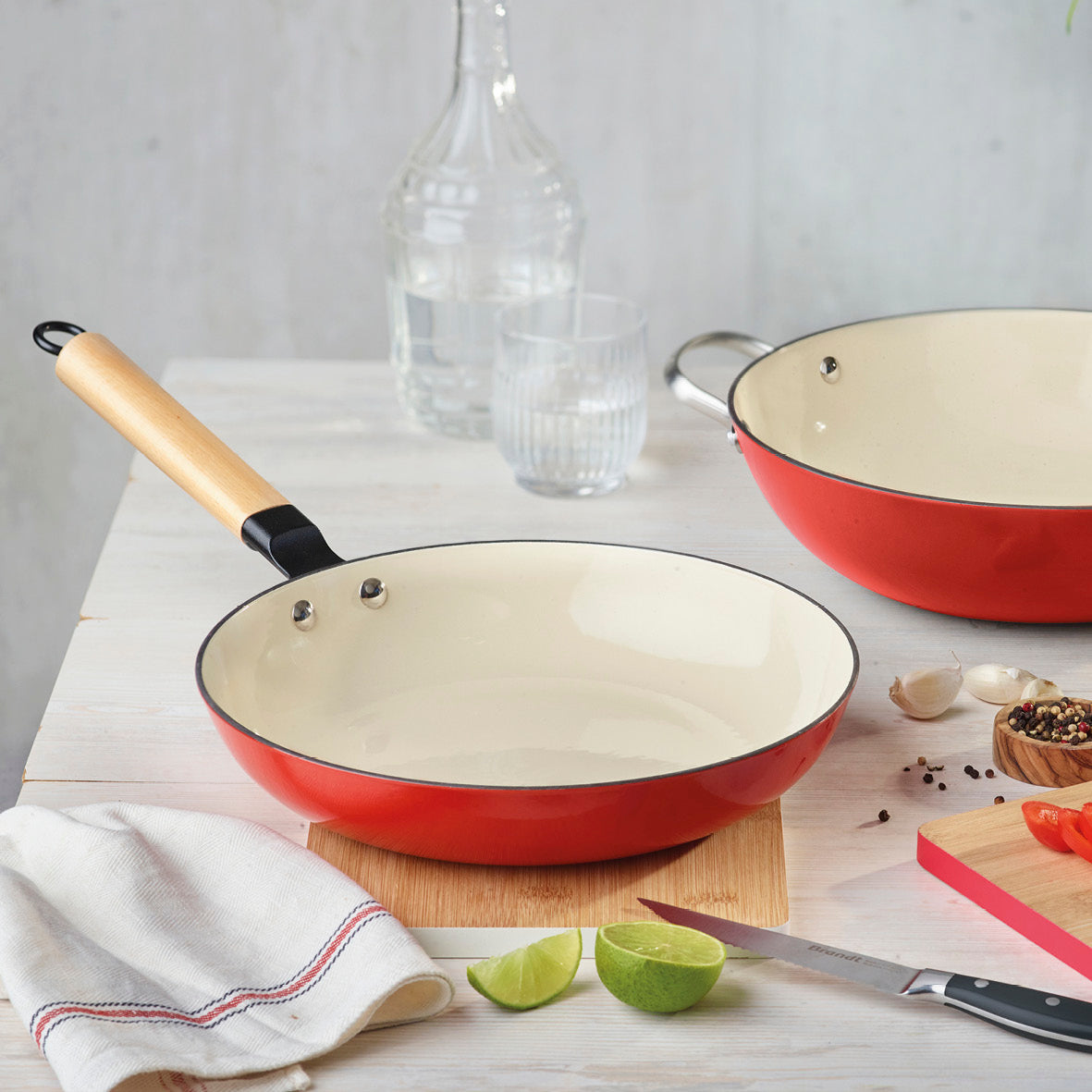 - The enamel coating prevents food from sticking, which allows for easy cleaning and the use of very little grease