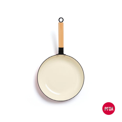 - Wooden handle: does not absorb heat, so the pan can be removed from the stove without potholders.